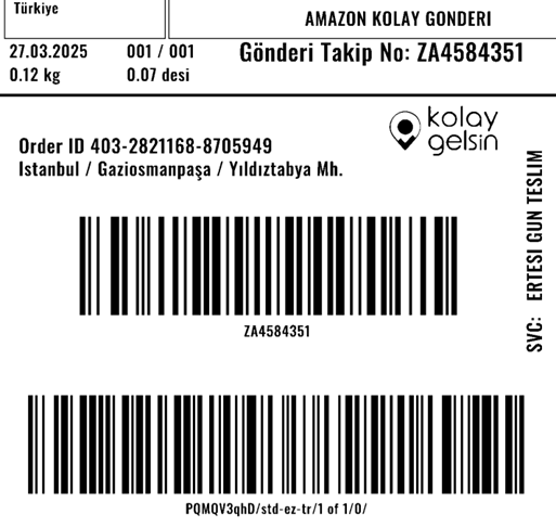 Amazon Kolay Gönderi kapsamında oluşan siparişe ait kargo etiketine