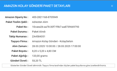 Amazon Kolay Gönderi kapsamında oluşan paket bilgilerinin detaylarına