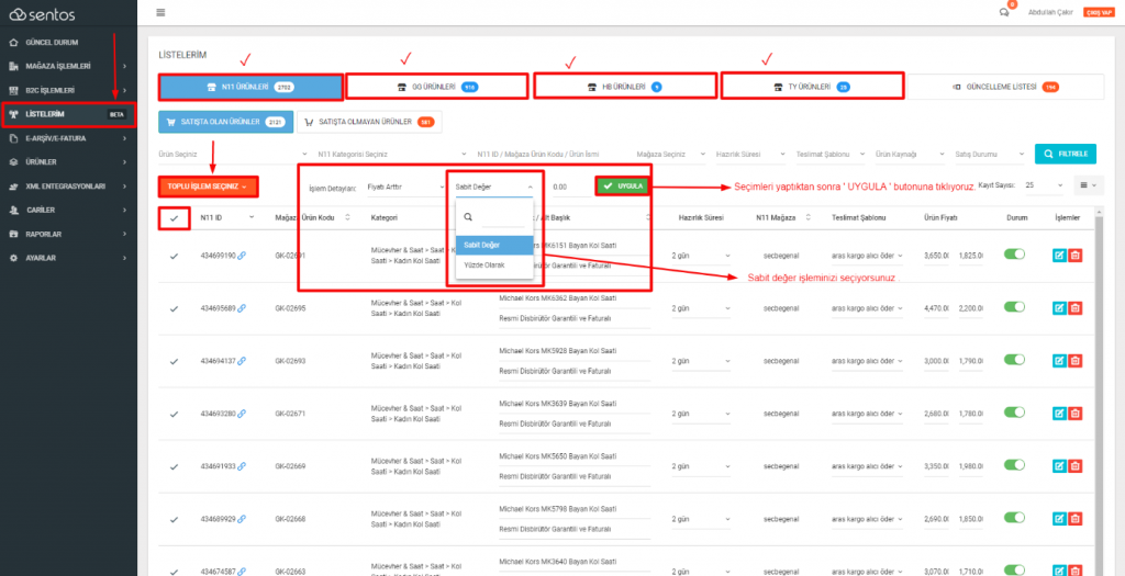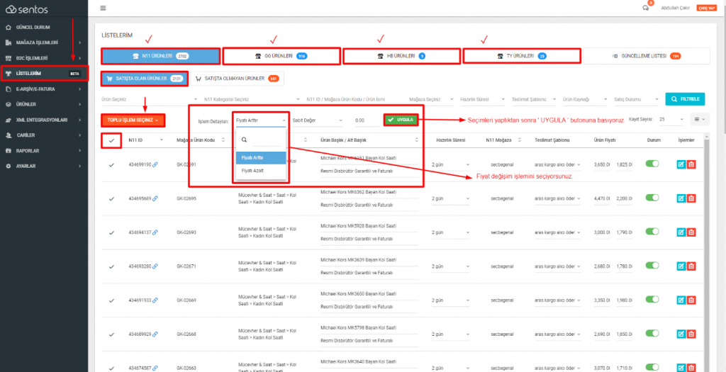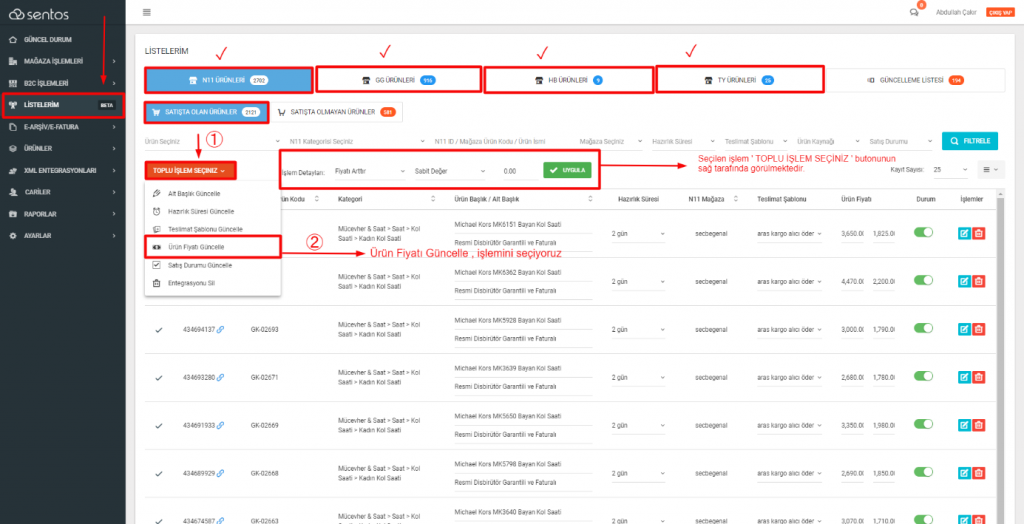 Sentos Panelinden , Listelerim → ( N11 & GG & HB & TY ) herhangi bir mağaza seçimini yapıyoruz → ‘ TOPLU İŞLEM SEÇİNİZ ‘ → ‘ Ürün Fiyatını Güncelle ‘ işlemini seçiyoruz . Seçilen işlem ‘ Toplu İşlem Seçiniz ‘ butonunun sağ tarafında yer almaktadır.