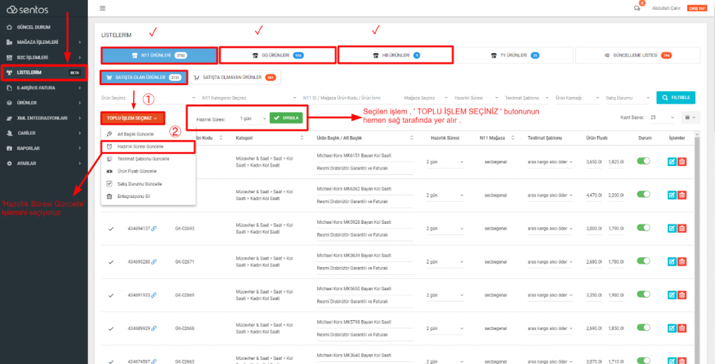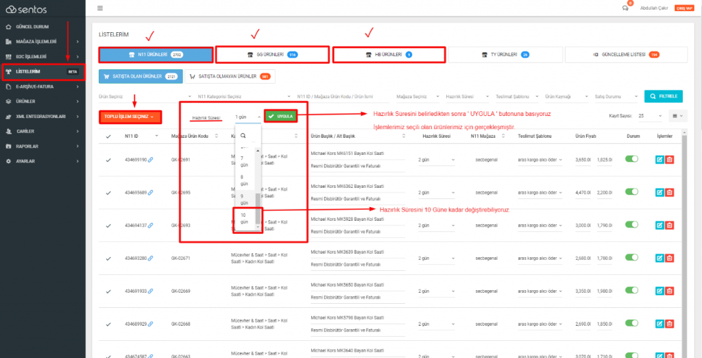 Sentos Panelinde , Listelerim → ( N11 &  GG  &  HB) herhangi bir mağaza seçimini yapıyoruz → ‘ TOPLU İŞLEM SEÇİNİZ ‘  →  ‘ Hazırlık Süresini Güncelle ‘ işlemini seçiyoruz .   Seçilen işlem ‘ Toplu İşlem Seçiniz ‘ butonunun sağ tarafında yer almaktadır.